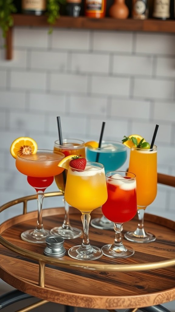 When hosting a garden party, cocktails can really elevate the atmosphere. The image showcases a delightful array of colorful drinks that are both refreshing and visually appealing. Each glass is distinct, featuring vibrant hues and garnishes like fruit slices and mint leaves. This variety not only adds flair but also caters to different tastes.